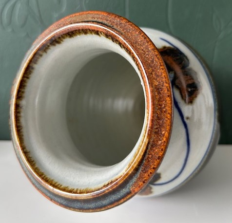 OverzichtMoonshire Pottery vaas van fijne (porseleinachtige) steengoedklei. Keramist Tony Barnes werkt al ruim dertig jaar met koperrood-, kobaltblauw-, rutiel en celadon glazuren vanuit Malmsbury Victoria. Hij maakt functionele potten en vazen die mooi zijn afgewerkt.