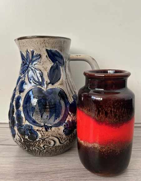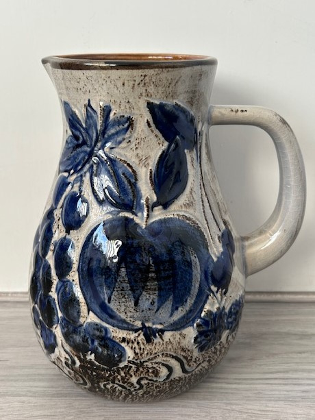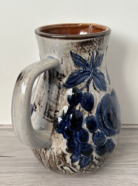 OverzichtScheurich forse grijsbruine hengselkan, model 479-20, uitgevoerd met een kobaltblauw druiven decor.