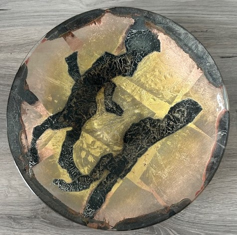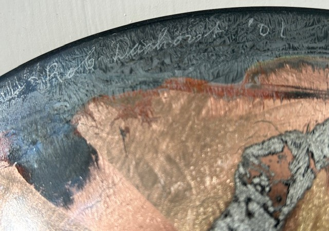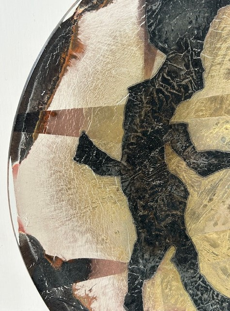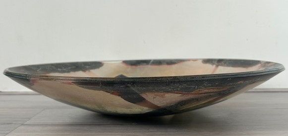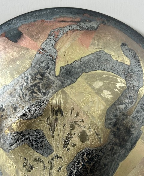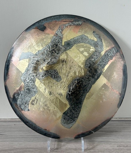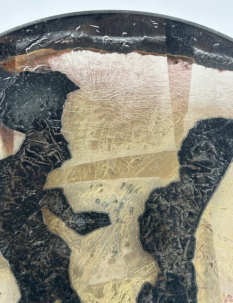 Zeer grote 'Folieschaal' (glasfusion) van glasatelier Daskas uit Amsterdam. De Folieschaal bestaat uit twee schalen met daartussen metaalfolie's, o.a. goudfolie. Tijdens het lange stookproces van circa 24 uur in de glasoven (900-1000 graden) versmelten de metaalfolie's met elkaar en ontstaat er een verrassende schakering aan kleuren. Deze schaal is uitgevoerd met een abstract patroon in goud, brons en zwart.