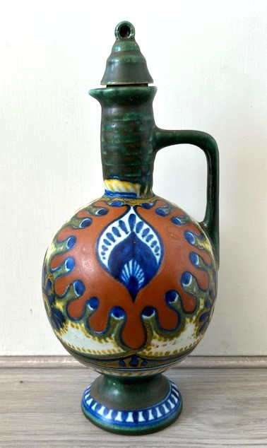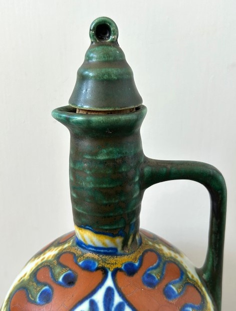 OverzichtPlateelbakkerij Zuid Holland kruik met het beroemde Rhodian-decor uit de jaren tien-twintig. Het kruikje is uitgevoerd met het kenmerkende matglazuur, geïnspireerd op 16e-eeuws aardewerk uit het Midden-Oosten (stad Iznik, Rhodos). Het decor met zijn rijke, diepe kleuren markeert de overgang van de glanzende Art-Nouveau naar de matglazuur-stijl. Daniël Harkink ontwikkelde het glazuur rond 1910. Het was een groot commercieel succes voor de Goudse plateelfabriek.