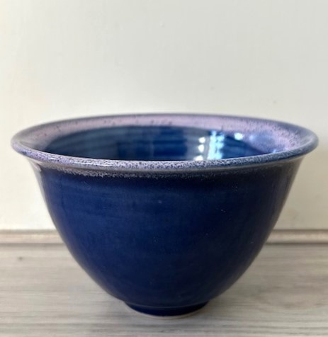 OverzichtPoterie Bouffelause hand gedraaide steengoed kom uitgevoerd met diepblauw en lila glazuur. De kom staat op een smalle voet.