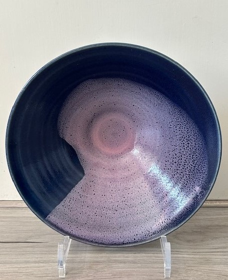Poterie Bouffelause hand gedraaide steengoed schaal uitgevoerd met diepblauw en lila glazuur. Gemaakt door een bekwame pottenbakker in de Haute-Savoie Frankrijk.