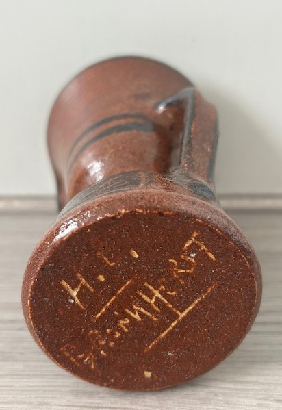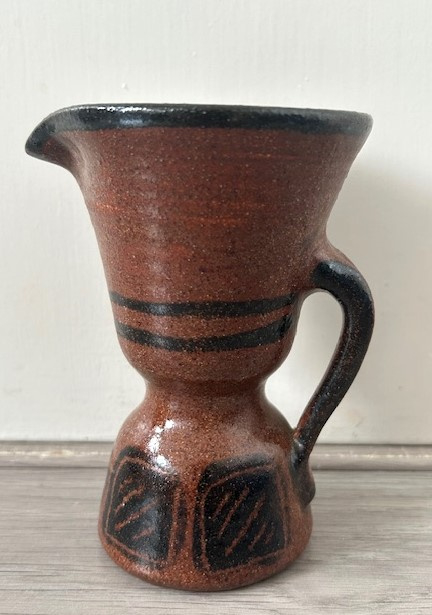 OverzichtHan Cornelissens oorvaasje met een wijd uitlopende bovenkant. Het bruine vaasje is gedecoreerd met zwarte lijnen en vierkantjes.