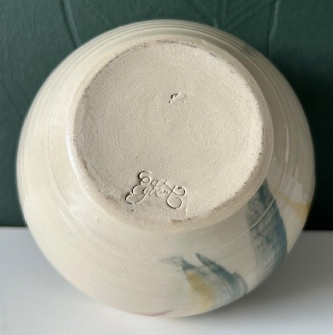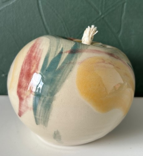 OverzichtPotterie Egbert handgevormde olielamp met katoenen lont. De crèmekleurige olielamp is gedecoreerd in de kleuren geel, lila en lichtgroen.