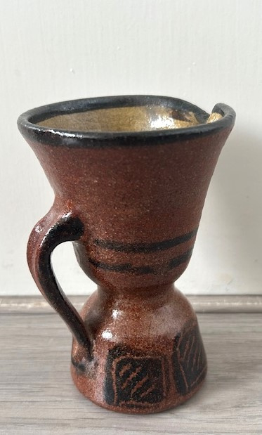 OverzichtHan Cornelissens oorvaasje met een wijd uitlopende bovenkant. Het bruine vaasje is gedecoreerd met zwarte lijnen en vierkantjes.