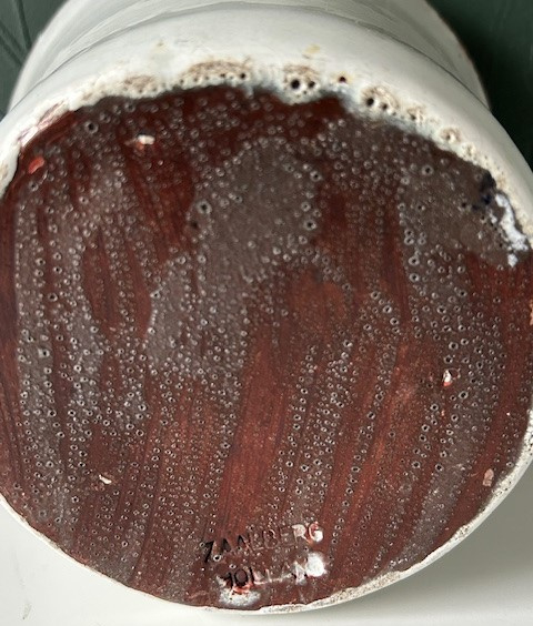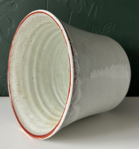 OverzichtPotterij Zaalberg forse handgedraaide cachepot. De wijd uitlopende pot is overtrokken met witgrijs (druip)glazuur en heeft aan de bovenkant een subtiele roodbruine rand.
