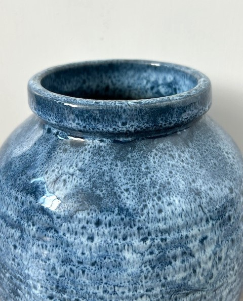 OverzichtHandgedraaide vaas met een gevlekt glazuur in lichtblauw en wit.
