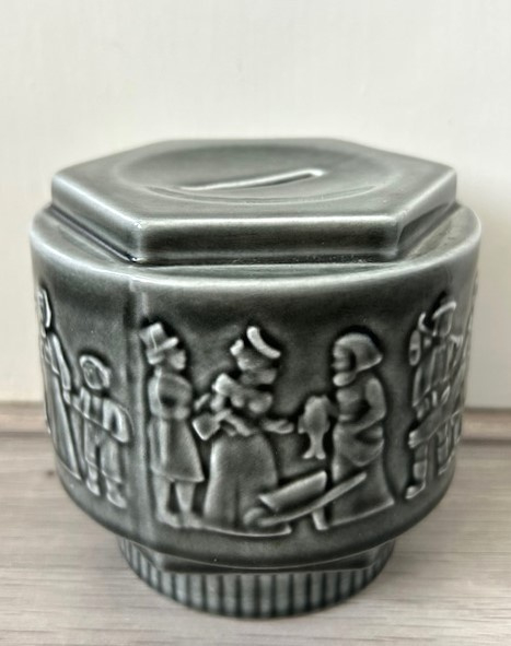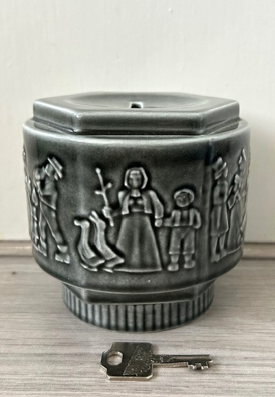 OverzichtRörstrand grijsgroen geldbusje van de Soderslatts Sparbank. Het geldbusje is voorzien van een reliefdecor met vrouwen, mannen en kinderen. Een decoratief spaarpotje compleet met sleutel.