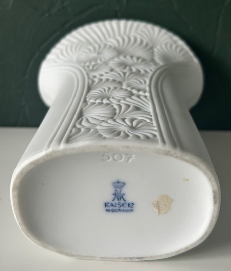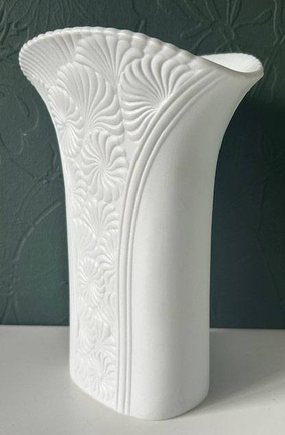 Kaiser ovale Op-art vaas van mat wit biscuit porselein. De vaas is gedecoreerd met een geometrisch reliëf patroon van ronde zonnen.