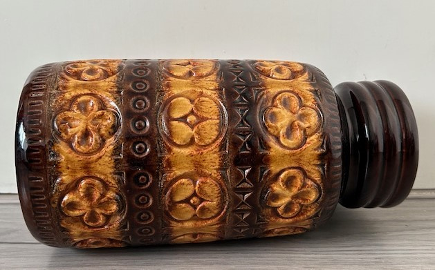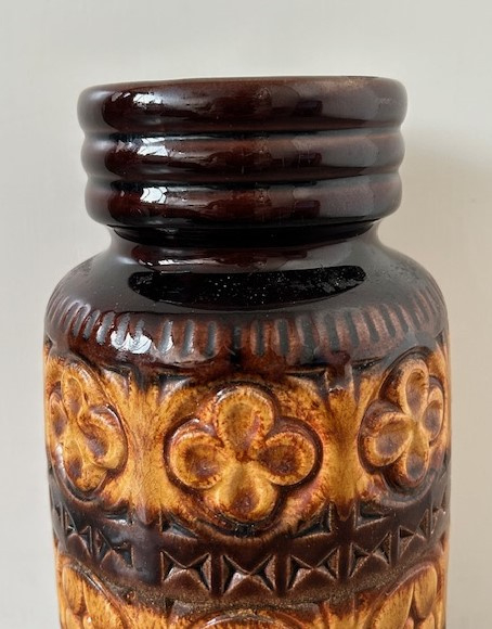 OverzichtScheurich grote licht- en donkerbruin geglazuurde vaas uit de 'Foligno' serie. Op de vaas is als decoratie een floraal reliëfdecor aangebracht.