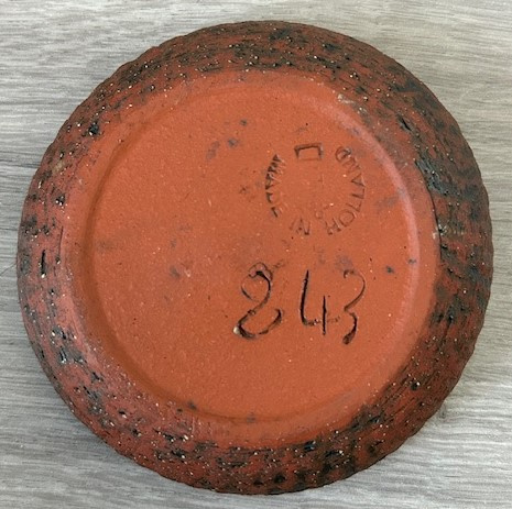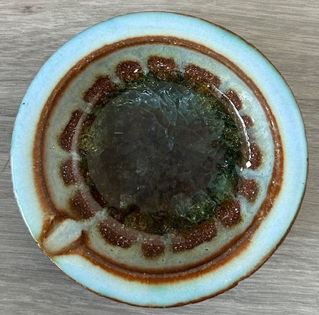 OverzichtPieter Groeneveldt turquoise geglazuurde ronde asbak. Op de bodem is een helder/blauwe glaslaag aangebracht.