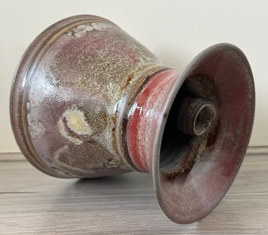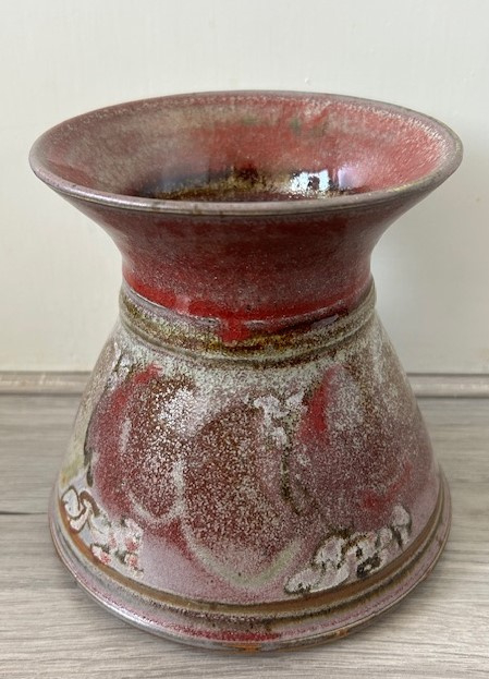 OverzichtMet de hand gedraaide steengoed vaas geglazuurd in rozerood en grijsgroen. De diabolo vormige vaas is aan de binnenkant afgewerkt met een kleine ring. Daardoor is de vaas ook te gebruiken voor een enkele bloem of tak.