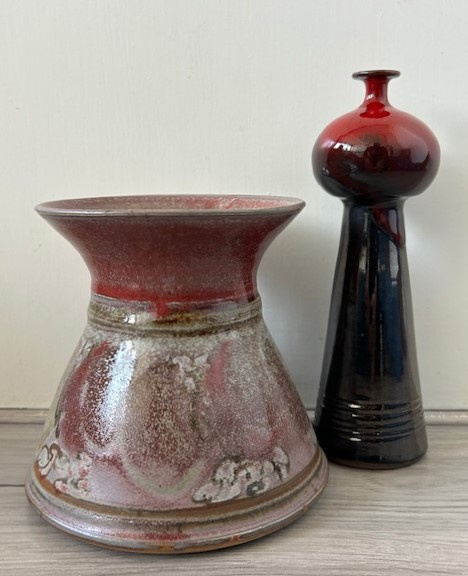 OverzichtMet de hand gedraaide steengoed vaas geglazuurd in rozerood en grijsgroen. De diabolo vormige vaas is aan de binnenkant afgewerkt met een kleine ring. Daardoor is de vaas ook te gebruiken voor een enkele bloem of tak.