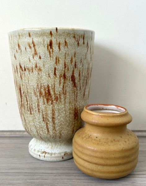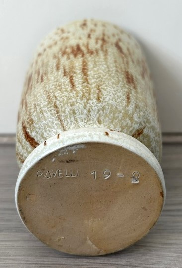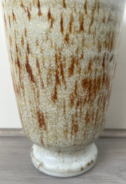 OverzichtPotterie Ravelli bekervaasje bedekt met lichtgroen en bruin gevlekt glazuur.