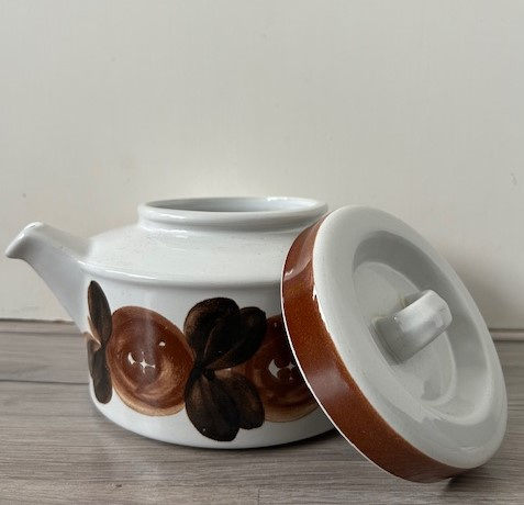 OverzichtArabia 'Ruija' theepot van steengoed. De pot is een ontwerp van Ula Procopé (design) en Raija Uosikkinen (ontwerp decoratie). De decoratie bestaat uit mosgroene bladeren en bruine pruimen.