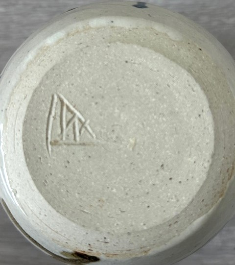 OverzichtCrèmekleurig handgedraaid bolvaasje met rand. Het vaasje is gedecoreerd met splashes in olijfgroen en lichtblauw.