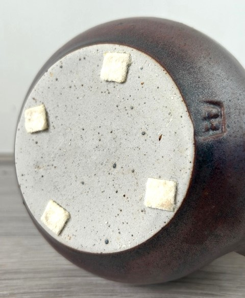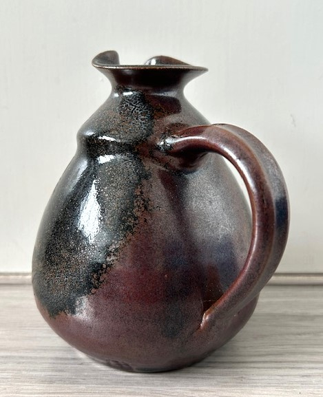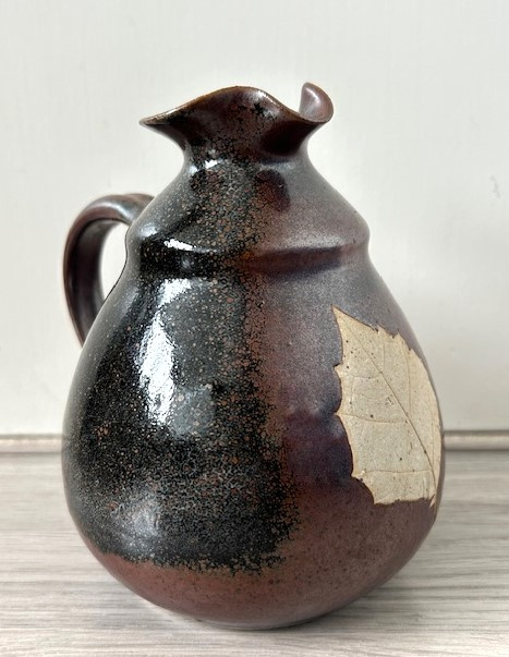 OverzichtHandgedraaide steengoed kan bedekt met ijzeroxide glazuur in bruin/antraciet. De hengselkan is gedecoreerd met een crèmekleurig boomblad.