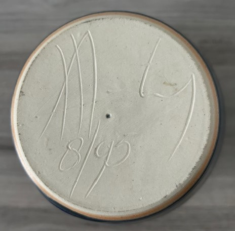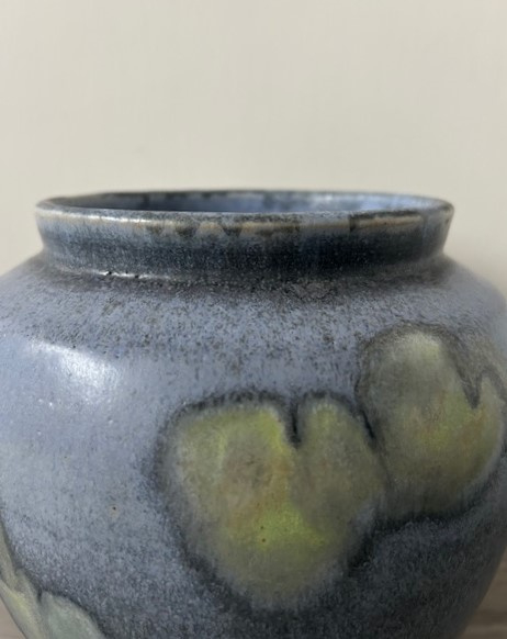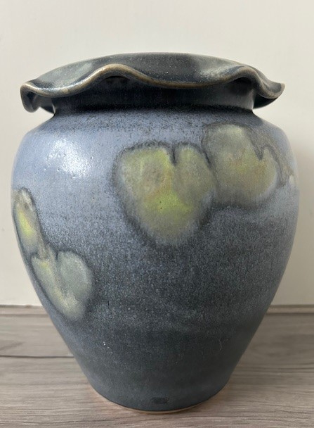 OverzichtLeo Martens forse handgedraaide dekselpot in lichtblauw, donkerblauw en geelgroen. Het deksel is uitgevoerd met een gegolfde, handgevormde rand.