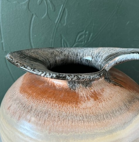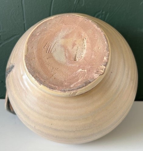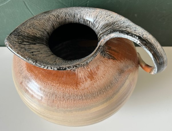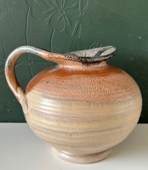 OverzichtMobach handgedraaide kan in lichtgeel, bruin en antraciet uit circa 1930. De kan (model no. 416) is voorzien van een sierlijk handgevormd hengsel.