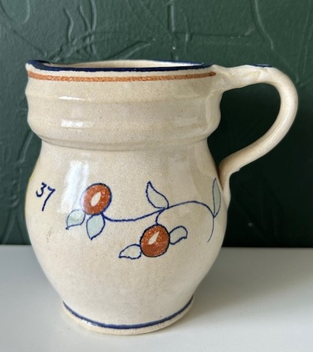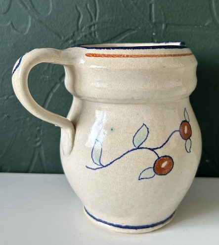 OverzichtGoedewaagen handgedraaid kannetje gemaakt ter gelegenheid van het huwelijk tussen koningin Juliana en prins Bernhard op 7 januari 1937. Het roomkleurige kannetje is versiert met hun initialen 'JB' en trouwdatum, een kroontje en de appeltjes van Oranje.