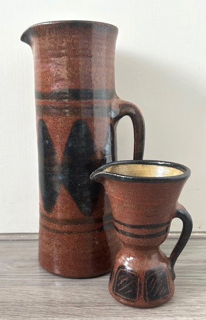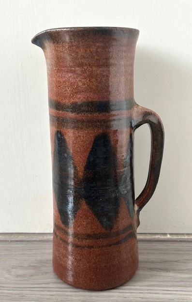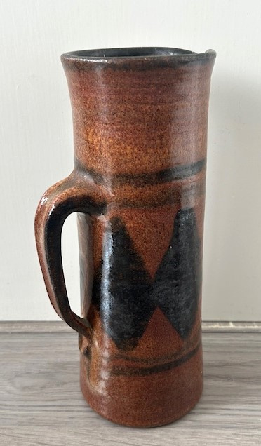 OverzichtHan Cornelissens hoge bruin geglazuurde handwerk kan. De hengselkan is gedecoreerd met een zwart ruitpatroon.