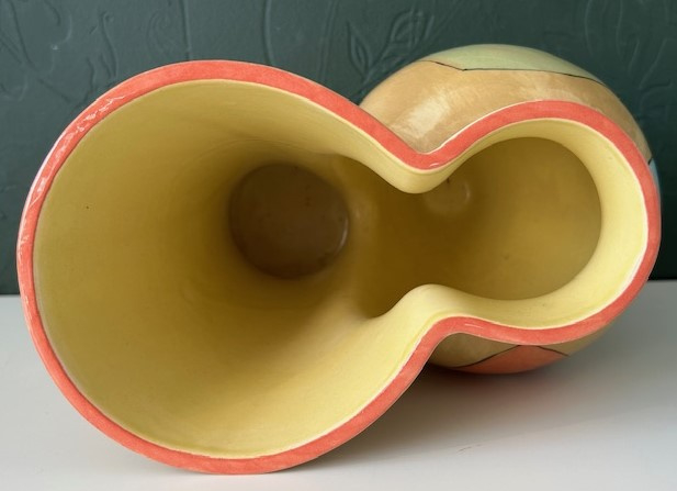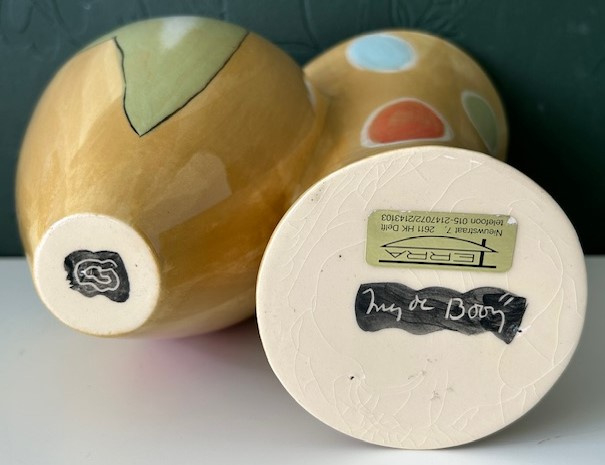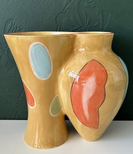 OverzichtGegoten 'dubbele vaas' van keramiste, beeldhouwer en tekenaar Ines de Booij (Geleen 1950). De mosterdgele vaas bestaat uit twee vormen die samen een organisch geheel vormen. Het werk van Ines de Booij wordt verkocht bij landelijk bekende keramiek galeries.