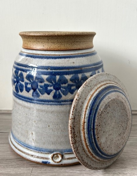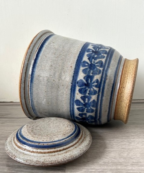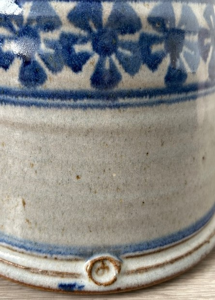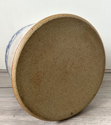 Grote wijd uitlopende steengoed (voorraad)pot. De grijs geglazuurde pot is gedecoreerd met een banddecor van inktblauwe bloemen. Gemerkt met stempel van de pottenbakker op de rand van de voet.