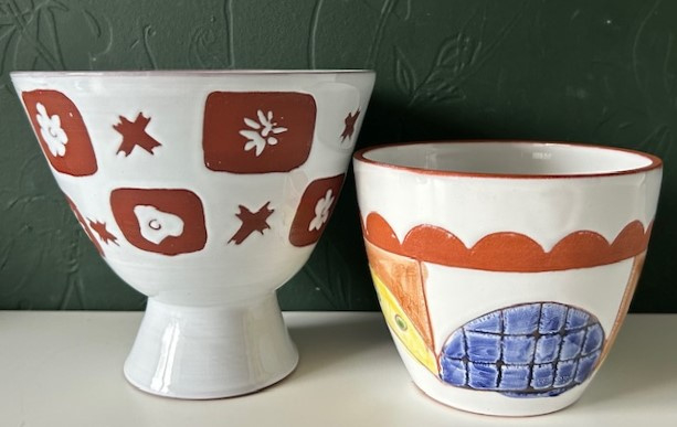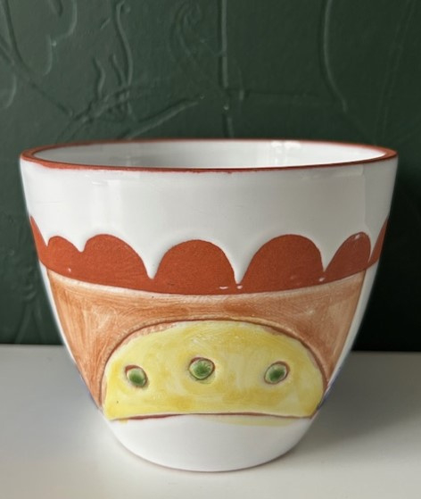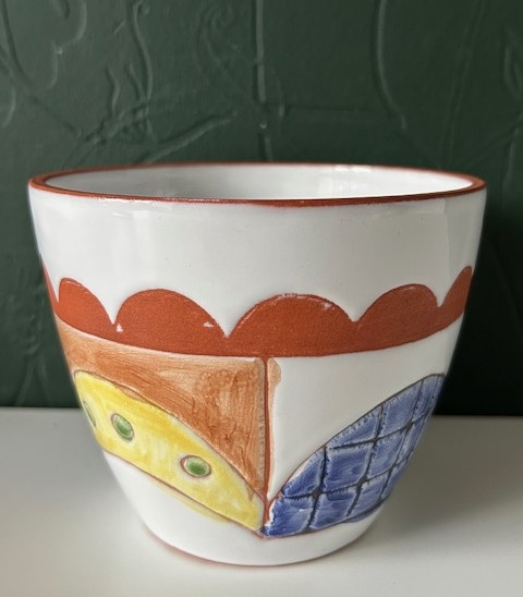 OverzichtAardewerk sgraffito bloempotje van roodbakkende klei. Het potje is bedekt met witte tinglazuur en ingekleurd met geel, groen, blauw en lichtbruin. In de stijl van Potterie Hans Wagner.