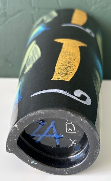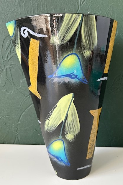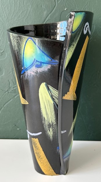 OverzichtJan Kamphuis zwart geglazuurde 'spiraalvaas'. De handgevormde vaas (samengesteld uit gedecoreerde platen klei) is versiert met bloemen in blauw, geel en groen. Jan Kamphuis slaat met zijn kleurrijke, functionele keramiek een brug tussen design en kunst.