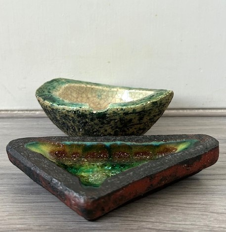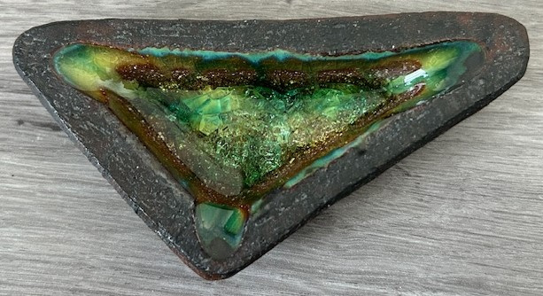 OverzichtPieter Groeneveldt driehoekig asbakje uit de jaren zestig. Het asbakje is op de bodem uitgevoerd met een glaslaag in groen/geel.