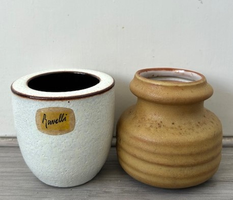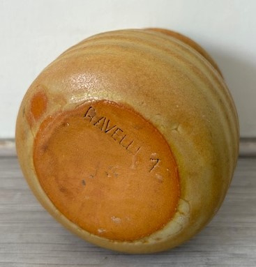 OverzichtPotterie Ravelli handgedraaid miniatuur vaasje in okergeel gestippeld glazuur. De binnenkant is wit van kleur.