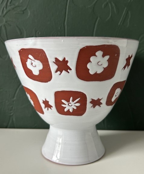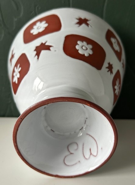 OverzichtPotterie Hans Wagner (1949-1972) sierpot op voet. De dun gedraaide pot is bedekt met witte tinglazuur en gedecoreerd met bloemvormen. Deze pot is gemaakt door Emile Wagner, een van de broers van Hans Wagner.