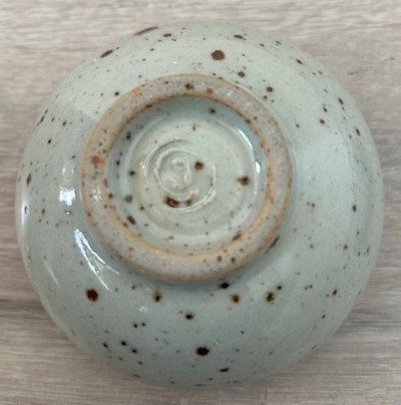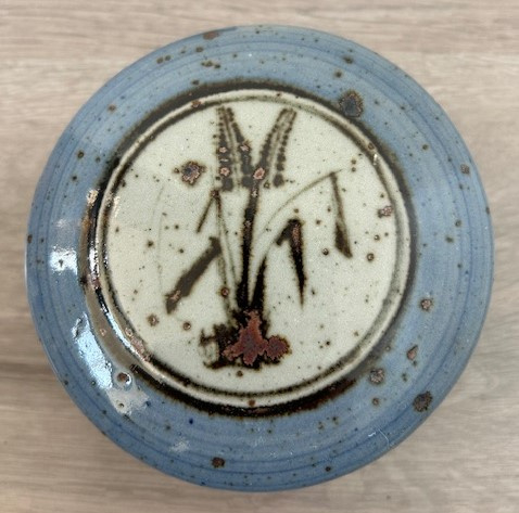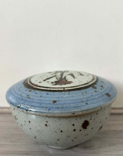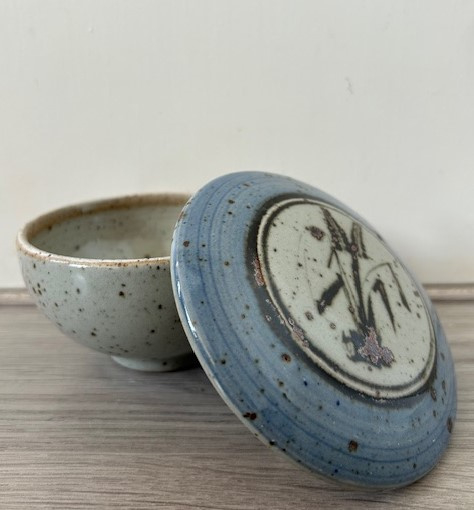 OverzichtDekselpotje in Japanse stijl van keramist Joop Crompvoets (1952-2022). Het potje is geglazuurd in grijs, bruin en lichtblauw.