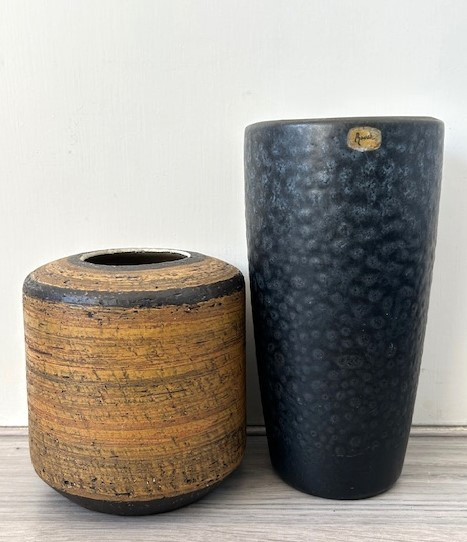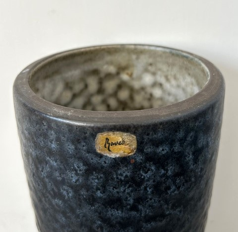 Hoge handgedraaide Ravelli vaas. De vaas is bedekt met grijsblauw glazuur en heeft een bobbelige structuur. De binnenkant is wit gewolkt van kleur.