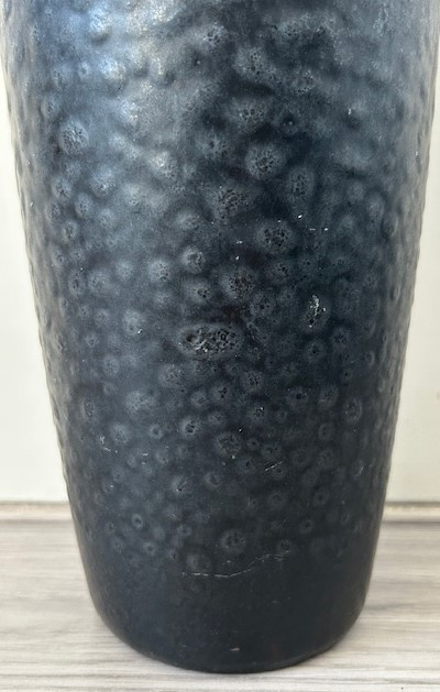 OverzichtHoge handgedraaide Ravelli vaas. De vaas is bedekt met grijsblauw glazuur en heeft een bobbelige structuur. De binnenkant is wit gewolkt van kleur.