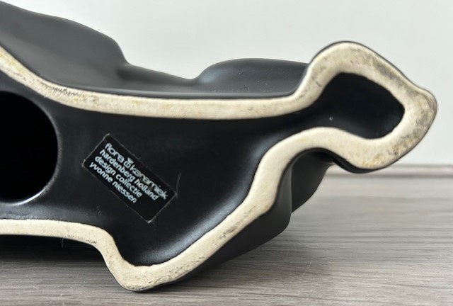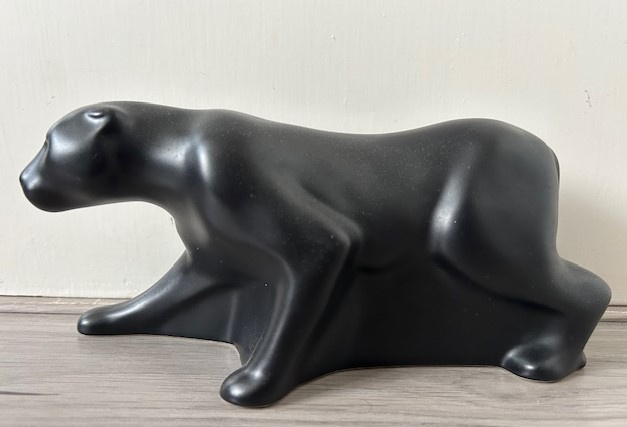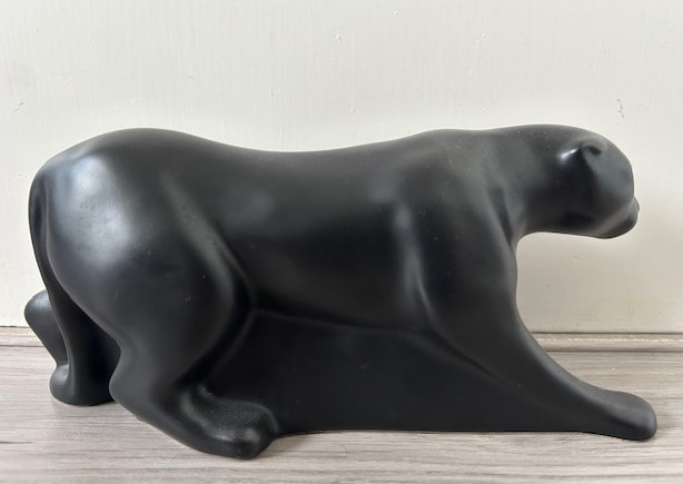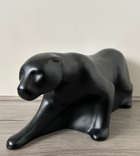 OverzichtFlora zwart geglazuurde plastiek van een panter. Afkomstig uit de Design Kollektie van Flora. De dierfiguren (o.a. beren, olifant, panter) hebben door de speelse en tegelijkertijd strakke geometrische vormen een grote aantrekkingskracht. De foto met Flora plastieken komt uit het boek 'Goudse Plastieken'.