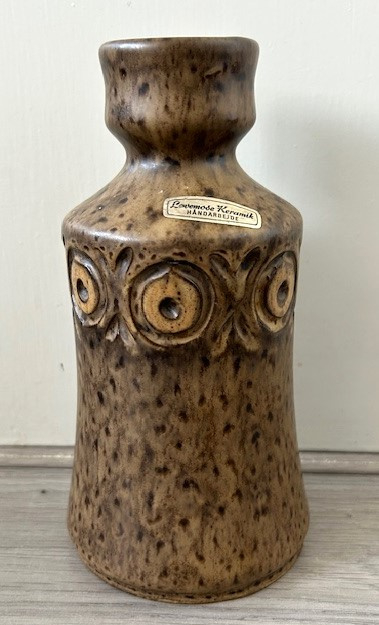Løvemose Keramik vaasjeLøvemose Keramik oorvaasje met ingekerfde decoratie in licht- en donkerbruin. Løvemose was een pottenbakkerij op het eiland Langeland (centraal Denemarken) die werd gerunt door het echtpaar Marie & Johannes Hansen. De…