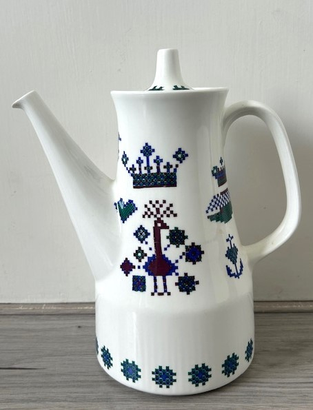 Figgjo Flint Menu koffiepot porseleinFiggjo Flint 'Menu' koffiepot porselein uit de jaren zestig. De pot is gedecoreerd met een (typisch Noors) geborduurd patroon van een pauw en een leeuw in groen, blauw en paars.