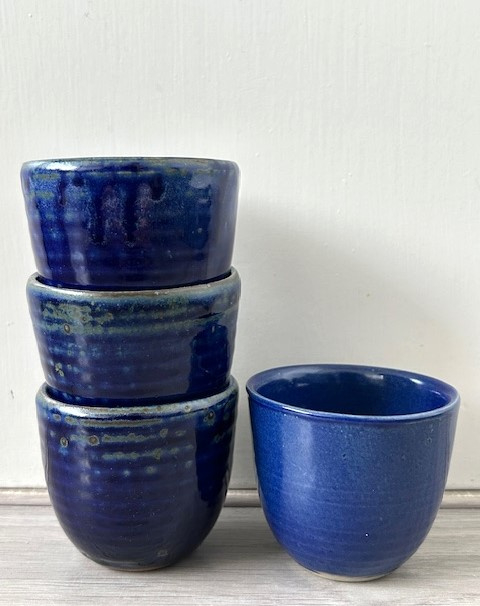 St. Paulusabdij set mokjes grèsSint-Paulusabdij set steengoed (grès) mokjes in een kobaltblauw-groen glazuur. Een mokjes is iets afwijkend van kleur (effen blauw).