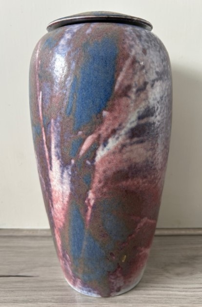 Bob Ernsting dekselpotBob Ernsting hoge handgedraaide steengoed dekselpot uitgevoerd met gemêleerd glazuur in blauw-groen-wit en lila/roze. Keramist Bob Ernsting volgde een lerarenopleiding in de vakken handvaardigheid en tekenen (d'Witte Lelie…