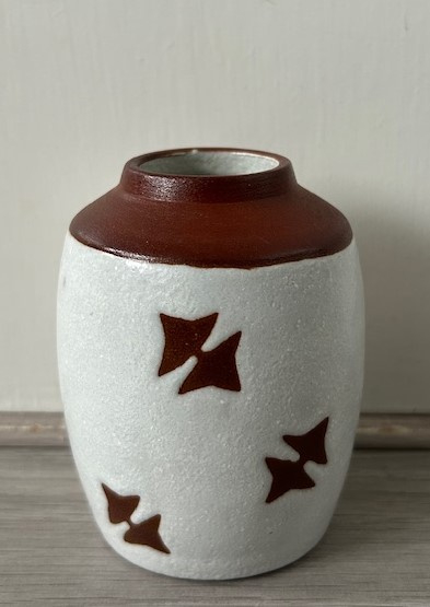 Potterie Ravelli vaasje met rood-wit decor 'sterren' uit het midden van de jaren vijftig.