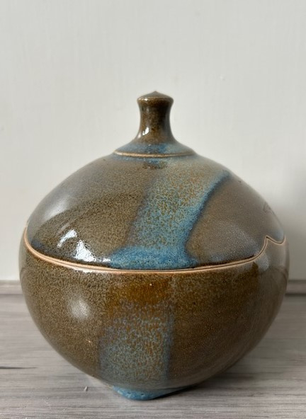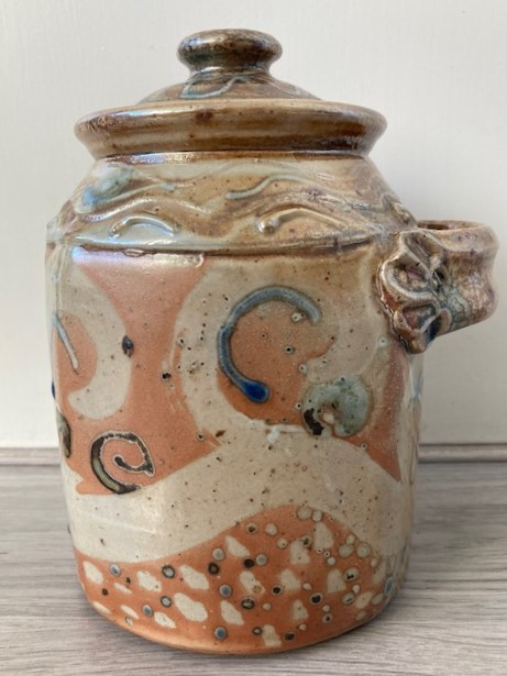 Robuuste handgedraaide dekselpot met een sierlijk handvat. De steengoed pot is uitgevoerd met groen, bruin en blauw gevlekt zoutglazuur. De vorm is enigszins hoekig. Ambachtelijk en zeer kundig gemaakt.