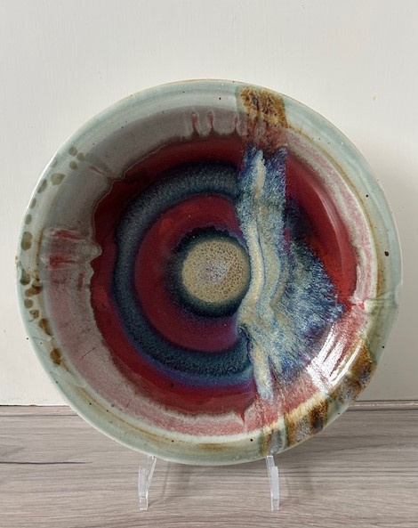 Leo Martens grote handgedraaide wandschotel (steengoed). De schotel/schaal is bedekt met rood-blauw-paars sang de boeuf glazuur en splashes in wit en groen.