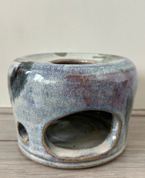 Steengoed rechaud uitgevoerd met fraai glazuur in blauw-groen-lila tinten. In de rechaud kan een waxinelichtje geplaatst worden voor het warm houden van bijvoorbeeld een thee- of koffiepot.