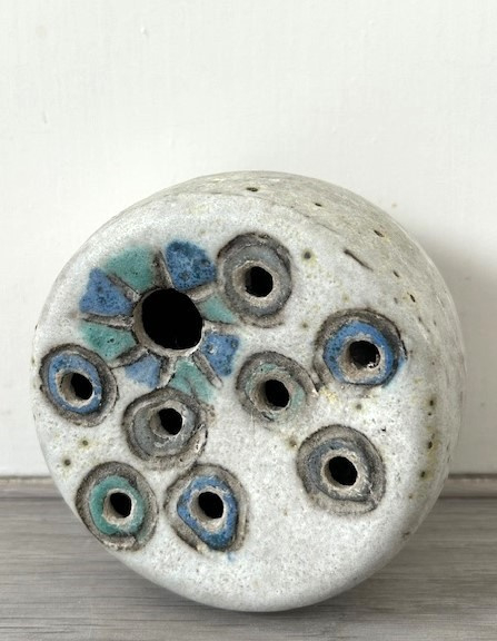 Hannie Mein licht gekleurde bloemsteker met accenten in groen en blauw. Het werk van Hannie Mein staat bekend om zijn naïeve stijl, vaak is de decoratie geïnspireerd op de natuur (dierfiguren, bloemen en planten).