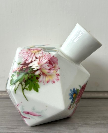 Manita Kieft (1961) diamantvormig vaasje van porselein. Door de verschillende facetten kan het vaasje op verschillende manieren worden neergezet. De bloem decoratie zie je steeds vanuit een ander perspectief. Elk vaasje is met de…
