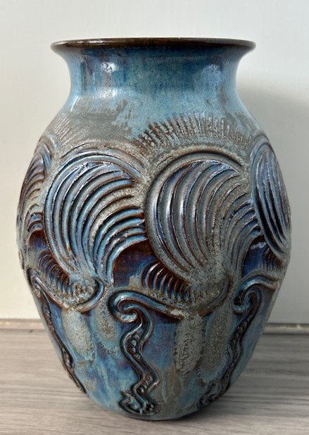 De Sphinx forse vaas met reliëf decoratie. De vaas is uitgevoerd met blauw- en bruin lusterglazuur. Een ontwerp van Wim Visser uit circa 1950. Deze reliëf-uitvoering zie je minder vaak.
