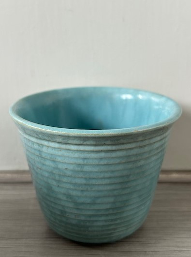Geribbeld bloempotje kleinste maat (foto 2 - midden) met mintgroen gewolkt glazuur.