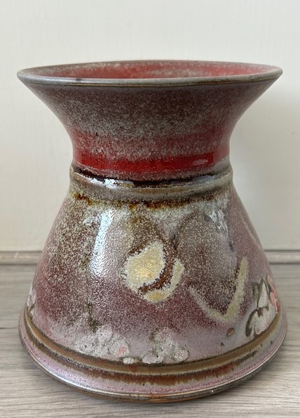 Studio keramiek vaas rozeroodMet de hand gedraaide steengoed vaas geglazuurd in rozerood en grijsgroen. De diabolo vormige vaas is aan de binnenkant afgewerkt met een kleine ring. Daardoor is de vaas ook te gebruiken voor een enkele bloem of tak.
