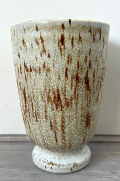 Ravelli bekervaasje lichtgroen bruinPotterie Ravelli bekervaasje bedekt met lichtgroen en bruin gevlekt glazuur.